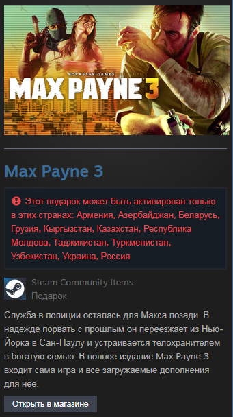 25.11.2023 10:31:26купил, боялся что гифт либо будет не тот, либо вообще будет недействителен, так как найти макса пейна 3 на ру регион - сложно. на деле все хорошо, после оплаты пришла ссылка, там гифт.
