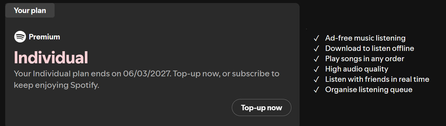 02.03.2026 0:13:1711.2025 приобрел подписку на 1 год на новый аккаут, спустя 3 месяца приложение начало писать, что мое местоположение и указанная в профиле страна не совпадают аккаунт был переведен статус бесплатного(хотя в профиле значилась операция о покупке подписки) обратился к продавцу, получил ответ, что с подпиской все ок и был послан в ТП спотифая там же меня послали окончательно: "Based on our findings, we can’t replace the time you’ve lost from your account, but you´re free to subscribe to a new plan with a payment method that matches where you´re currently located"