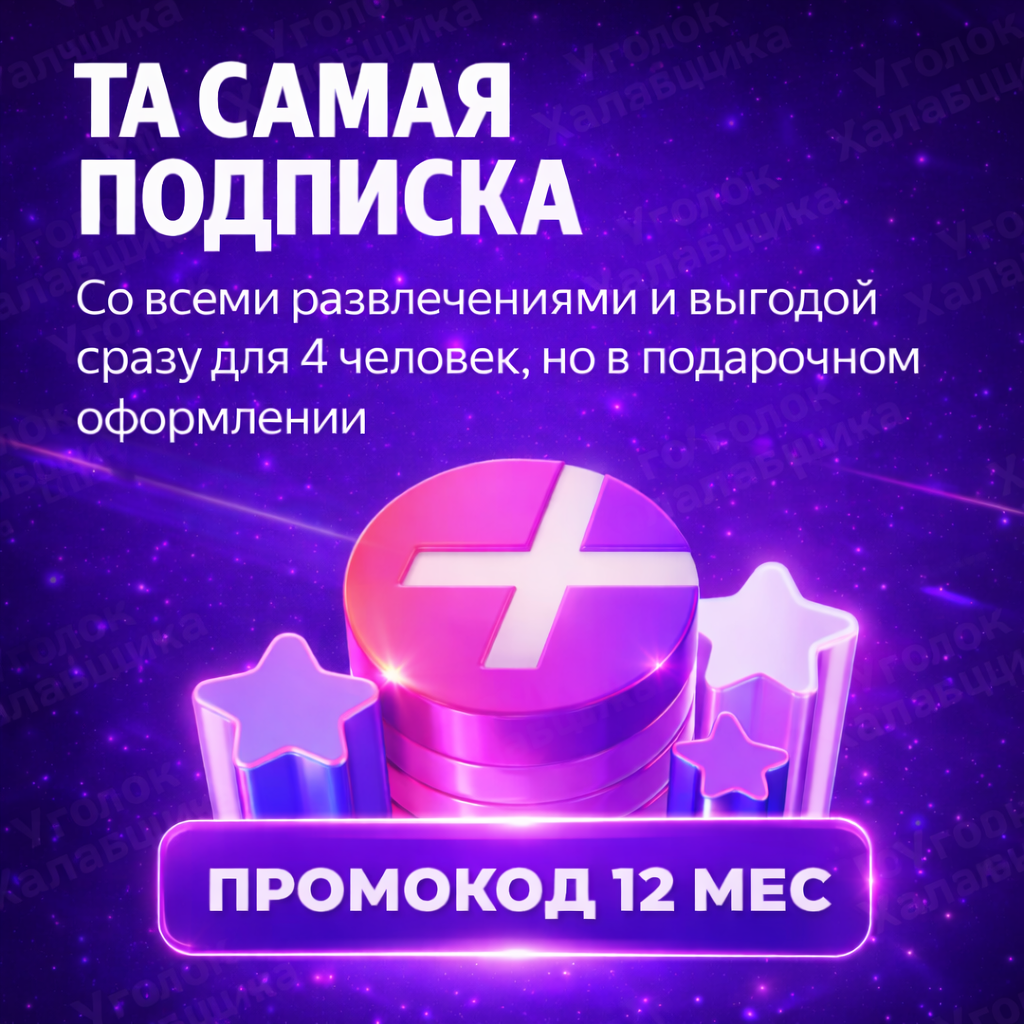Сразу после покупки вы получите официальный код активации подписки Я+ МУЛЬТИ на 12 месяцев. Вы сможете добавить ещё три аккаунта к семейной подписке!