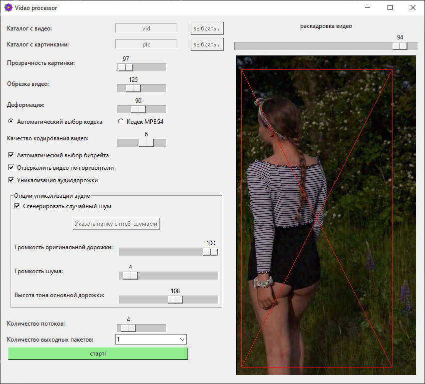 Софт предоставляет множество возможностей для обработки видео, включая нанесение прозрачных изображений поверх видео, искажение геометрии, обрезание и удаление метаданных из видео. Благодаря этому можно заливать видео в тикток (Tik-Tok), instagram reels и подобные сервисы, которое на сайте уже есть, и проходить тем самым проверку на уникальность видео. Вы можете выбирать битрейт и уровень сжатия выходных видео и даже автоматически выбирать кодек для достижения максимального качества.Наш софт работает с видео любого разрешения и соотношения сторон, а также поддерживает mp4-видеофайлы. Программа легко работает на windows, начиная с версии 8.1 и выше (x64). (windows 8, 10, 11)