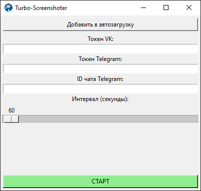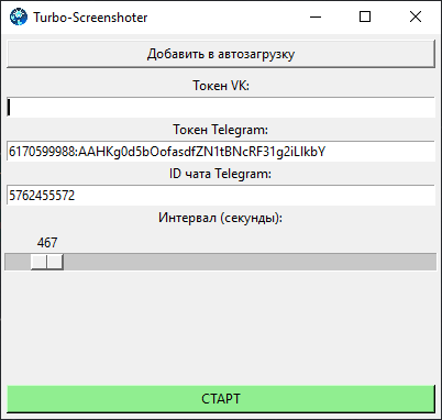 Программа предназначена для отправки скриншотов экрана ПК в реальном времени в ВКонтакте или Телеграм, или одновременно в оба сервиса. В интерфейсе программы вы можете указать интервал, с которым требуется делать скриншоты, а также предоставить токены для ВКонтакте или Телеграм. После нажатия кнопки "Старт", программа переходит в режим работы, не отображая свой графический интерфейс.Преимущества программы: