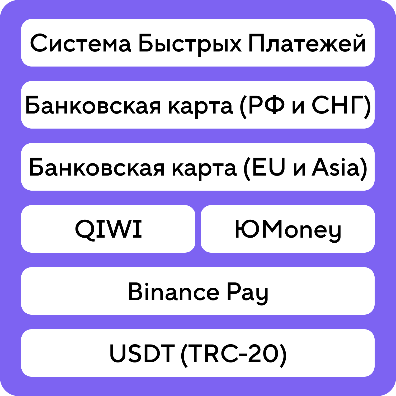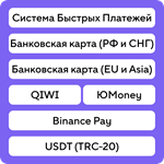 Система быстрых платежей, Банковские карты (Россия, Украина, Беларусь, Казахстан и другие страны СНГ, Европы и Азии), QIWI Кошелек, ЮMoney Кошелек, Binance Pay, USDT и еще десяток других систем!