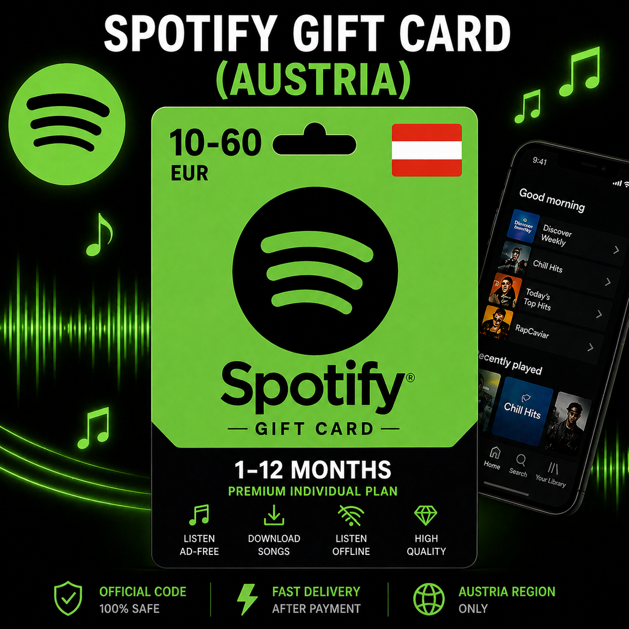 Spotify Gift Card (Австрия) 10–60 EUR | Код пополнения Spotify