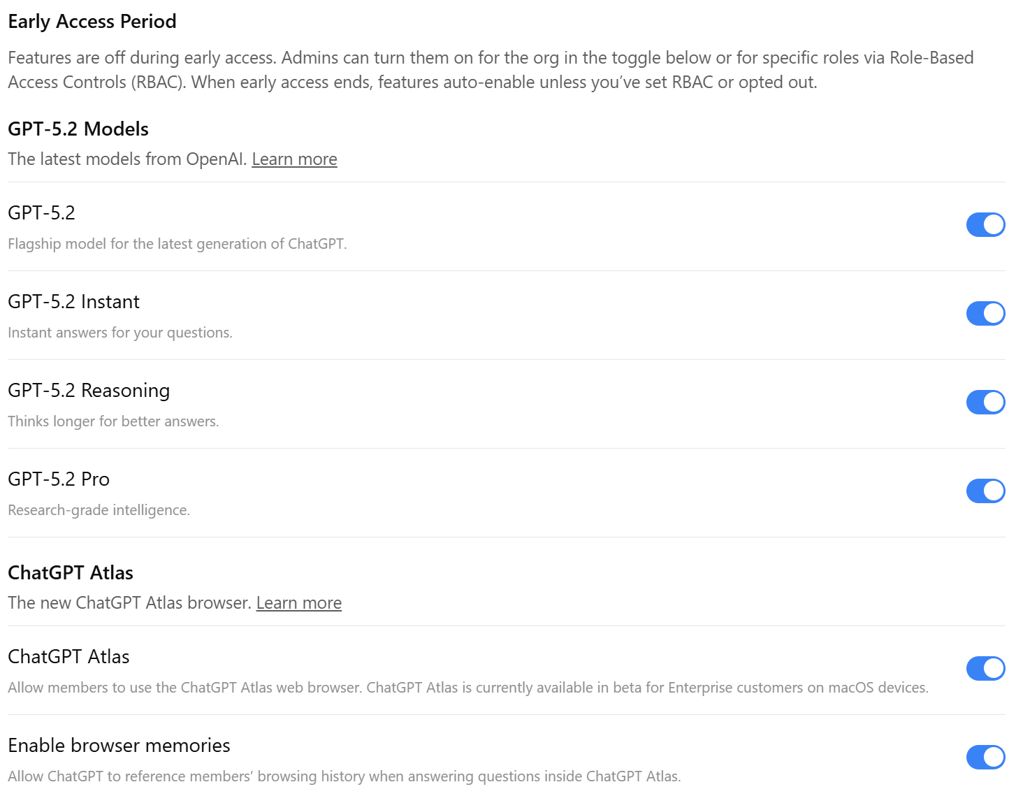 Все бета-модели GPT-5.2 включены на уровне Рабочего Пространства через настройки администратора: