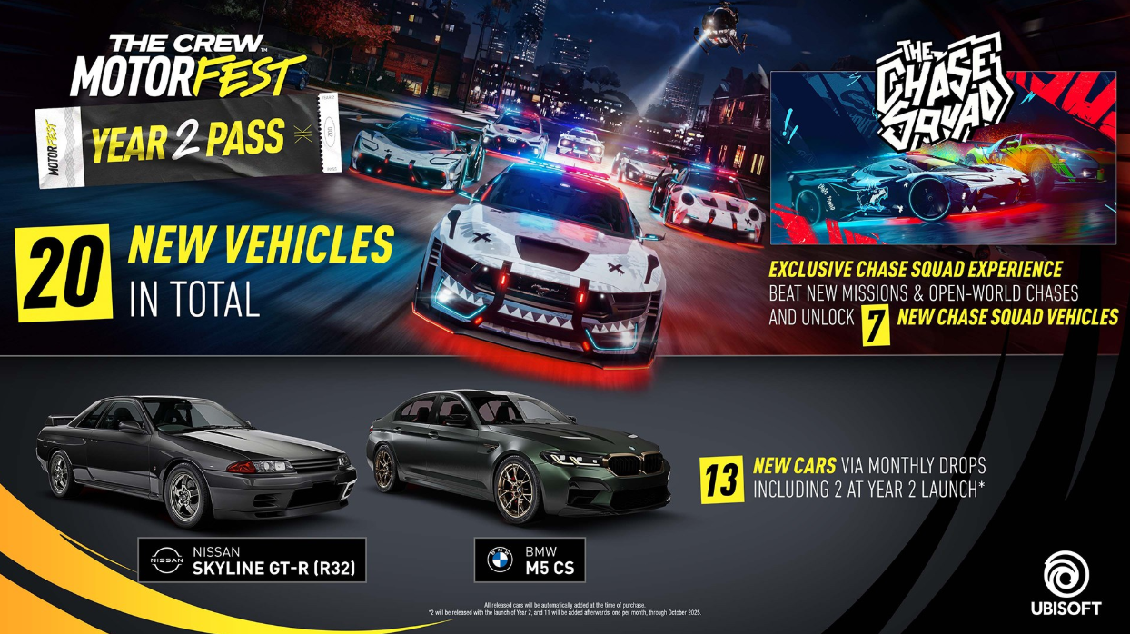 - Chase Squad – обгоняйте соперников в новом плейлисте и новых испытаниях в открытом мире. Одержите верх и разблокируйте 7 эксклюзивных транспортных средств Chase Squad: 6 автомобилей и 1 вертолет с уникальными возможностями персонализации. Визуальные эффекты, подсветка, особая краска – блистайте в роли стража Motorfest.