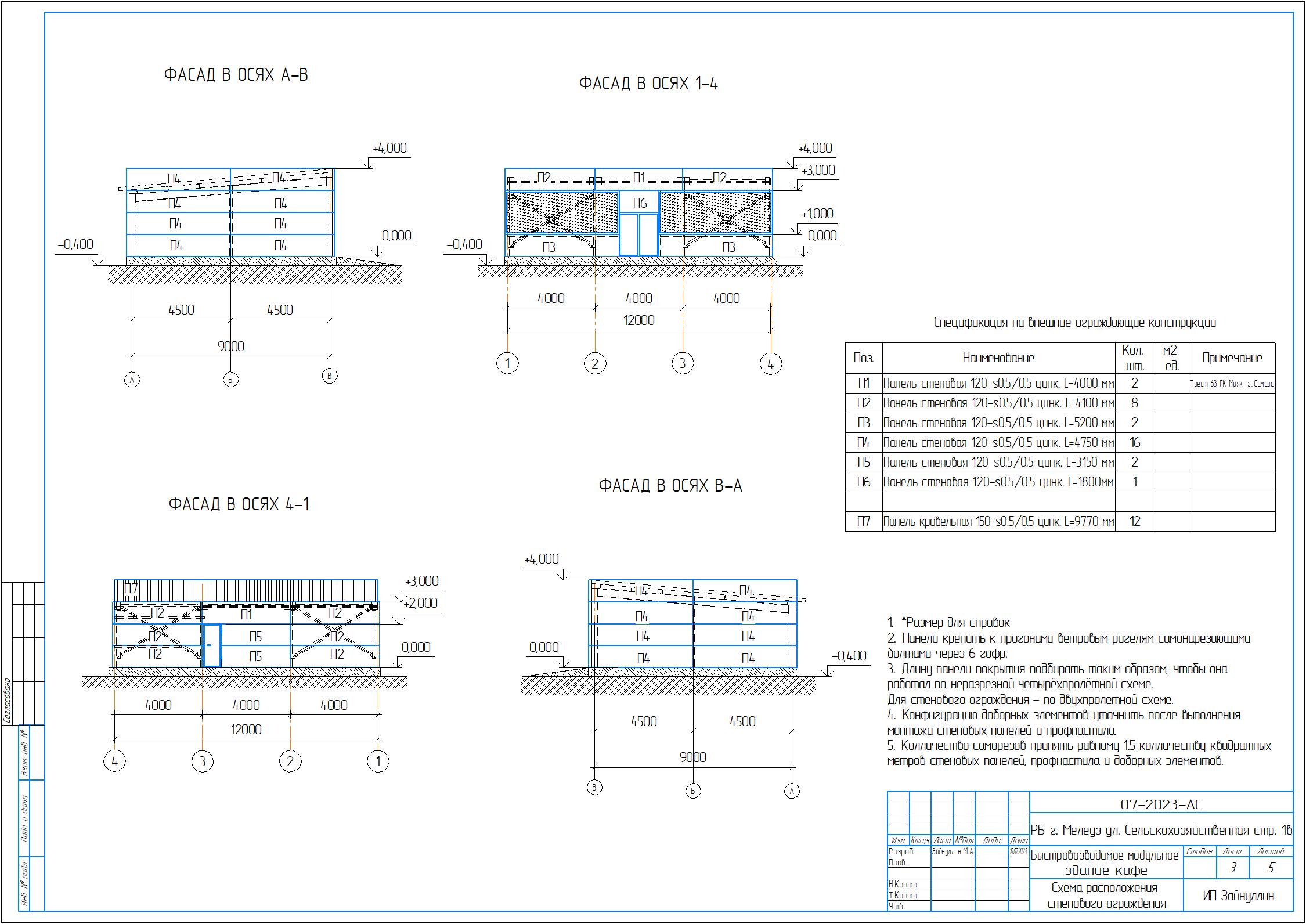Альбомы рабочей исполнительной документации на здание кафе из металлического каркаса и сэндвич панелей, разделы: АР( архитектурные решения, фасады), КМ(конструкции металлические метал каркас) КЖ (конструкции жби) с объемами спецификации на материал в формате pdf, cdw.