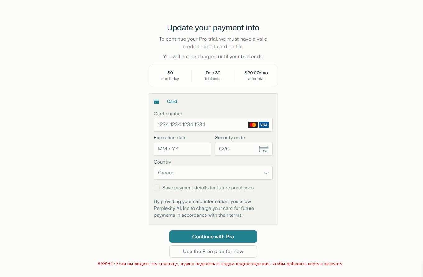 > Вы получили письмо от Perplexity с просьбой добавить/привязать карту, ИЛИ