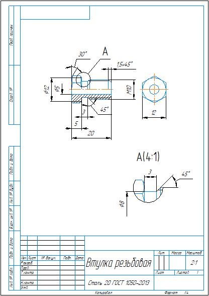 Рабочий чертеж детали втулка резьбовая в программе Компас 3D