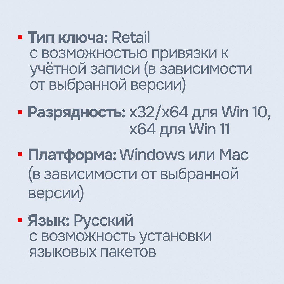 • Тип лицензии: Retail, бессрочная, привязана к Вашему аккаунту Майкрософт (в зависимости от выбранной версии)