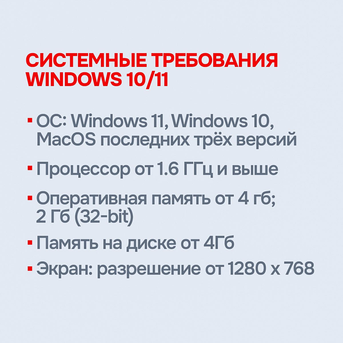 • Для Windows: Windows 10, Windows 11, Процессор: от 1.6 GHz, 2 ядра, Оперативная память: 4 GB; 2 GB (32-bit), Свободное место на диске: 4 GB, Экран: минимальное разрешение 1280 x 768, Графика: DirectX 9+, поддержка WDDM 2.0