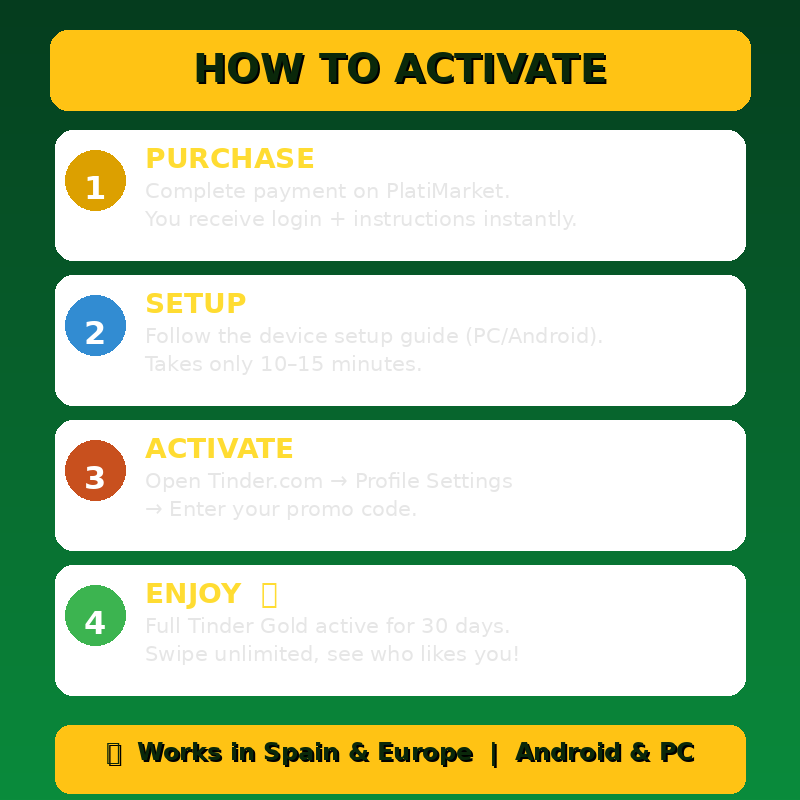 Получите Tinder Gold мгновенно после оплаты - проверенный продавец PlatiMarket!✅ Идеально для Испании - работает без проблем в Испании