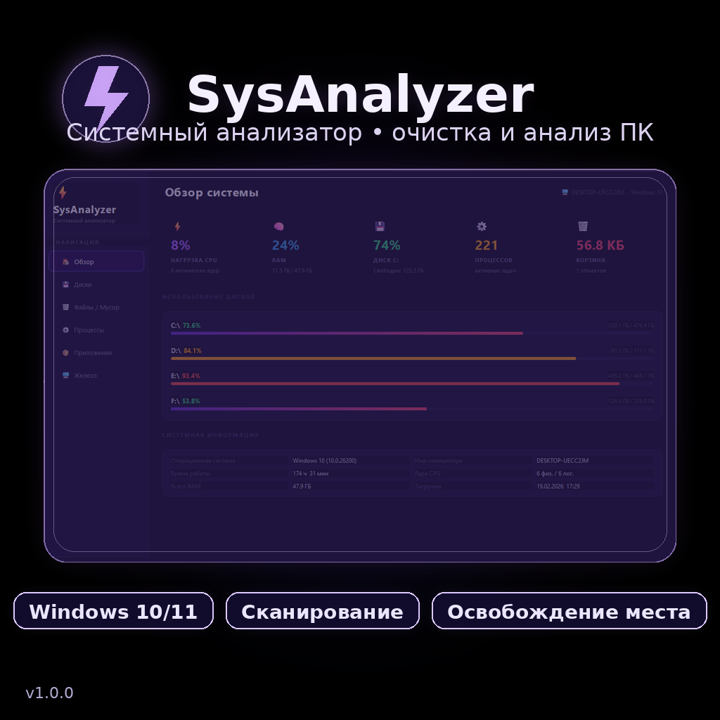 Быстро помогает освободить место: сканирует компьютер, показывает ненужные файлы и тяжёлые папки.System Analyzer — утилита, которую я сделал сам. Задача простая: быстро понять, что забивает диск, и аккуратно освободить место без ручного копания по папкам.