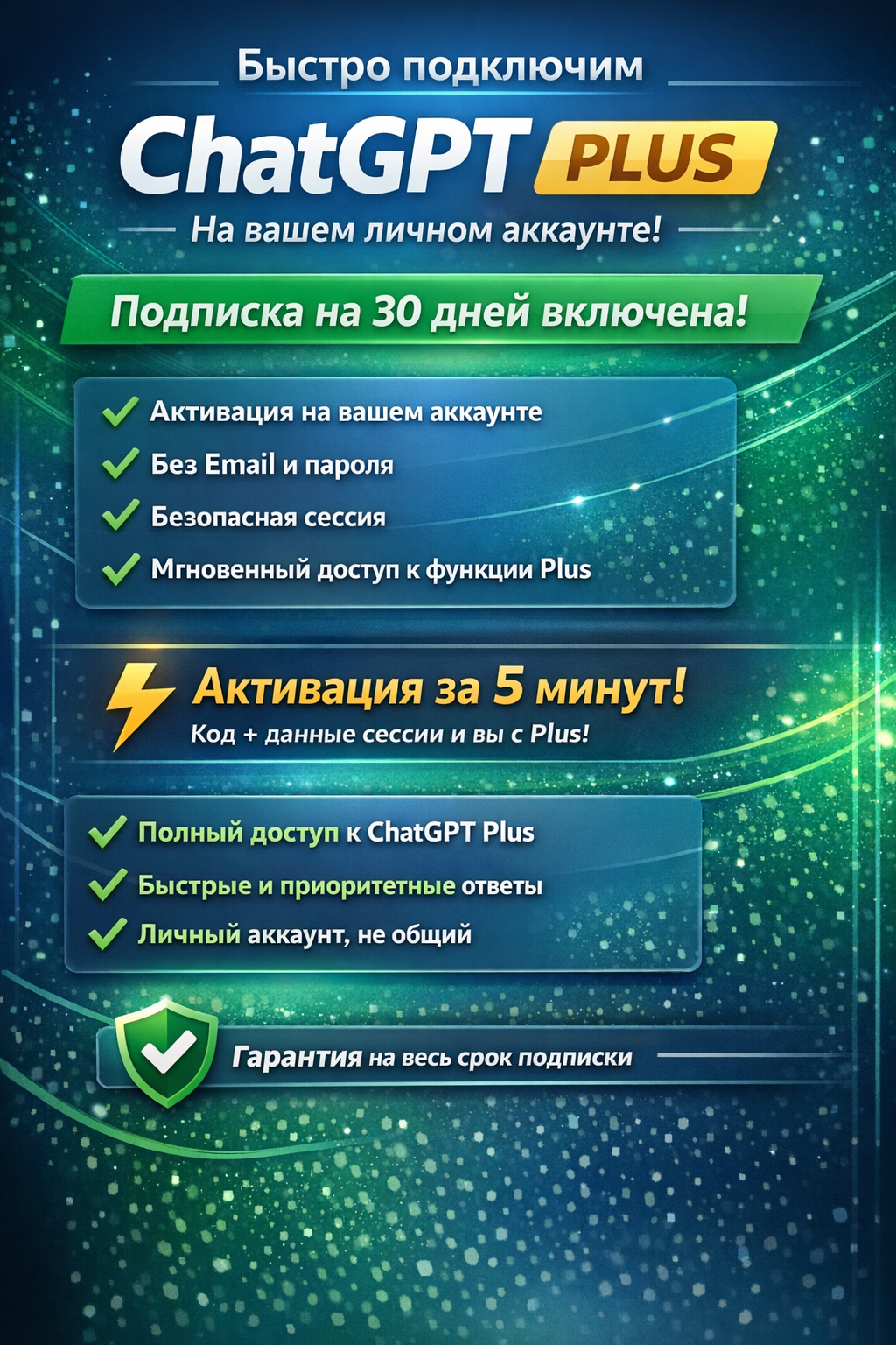 Время активации: обычно 5–30 минут после получения данных сессии• Покупатель должен отправить данные сессии ChatGPT