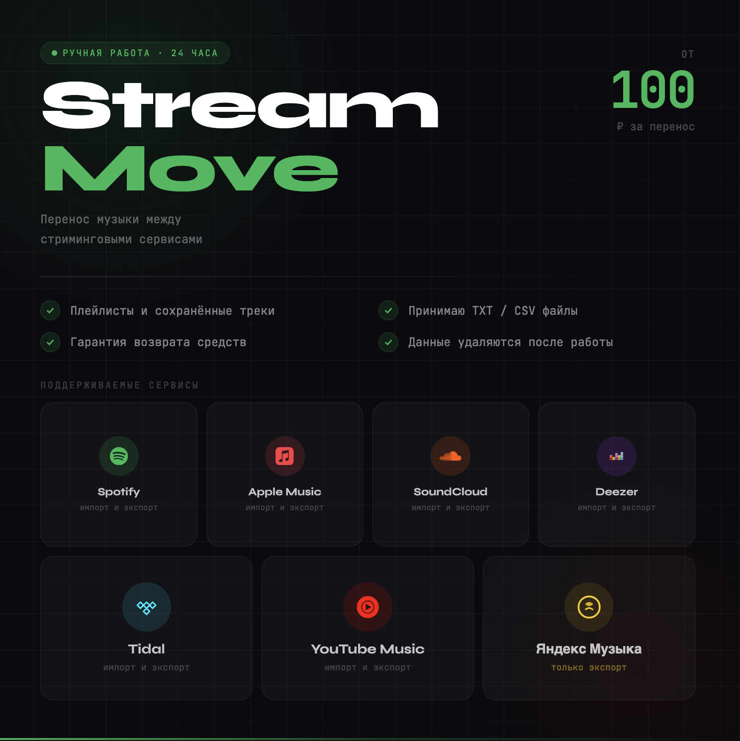 В течение 24 часов после оплаты ваша музыкальная библиотека будет перенесена в нужный сервис. Треки будут добавлены в ваш аккаунт — вы получите сообщение с подтверждением и скриншотом результата.