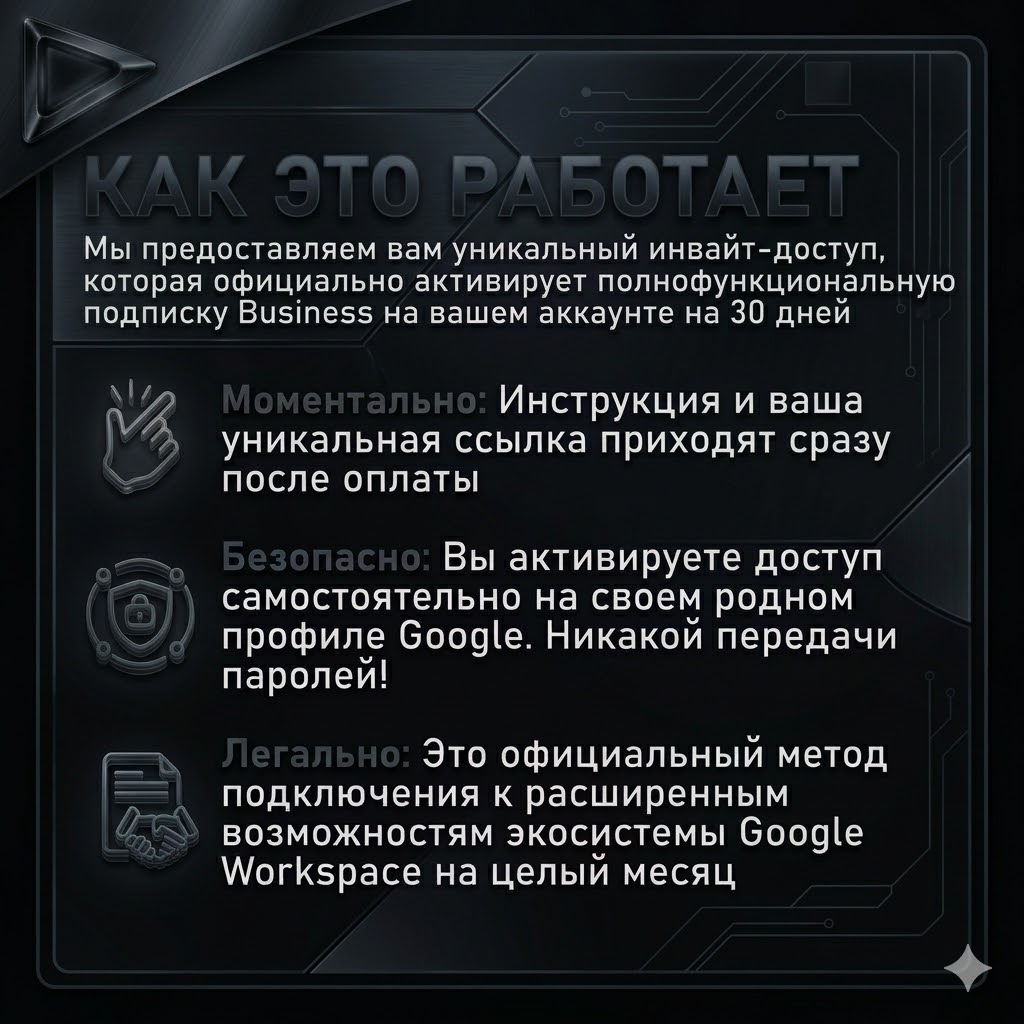 Получите мгновенный доступ к корпоративной мощи Google Gemini Business (Pro/Advanced). Официальная подписка, премиальные инструменты и железная стабильность.🤔 ПОЧЕМУ ЭТО ВЫГОДНО ДЛЯ ВАС (Честно о товаре)