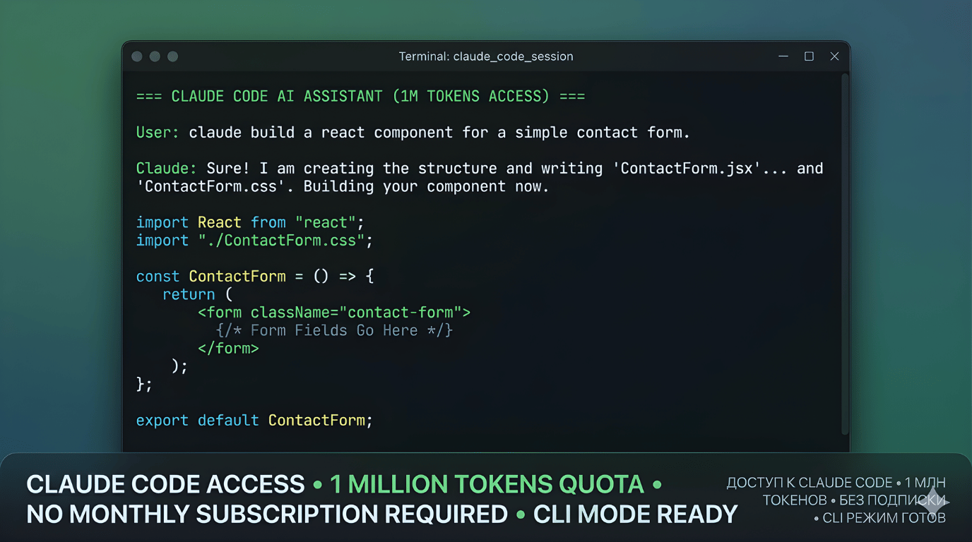 Получите высокоэффективный доступ к Claude Code с квотой в 1 000 000 токенов. Идеально подходит для разработчиков, которые хотят использовать самые мощные модели ИИ прямо в своем терминале, не оплачивая дорогие ежемесячные подписки.