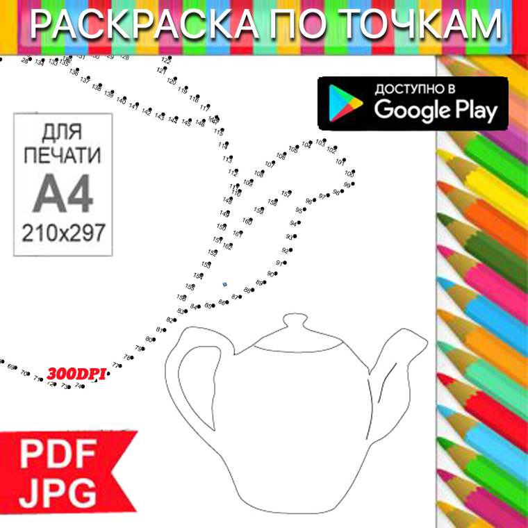 Чайник Раскраска По точкам Антистресс для распечатки на принтере и Android