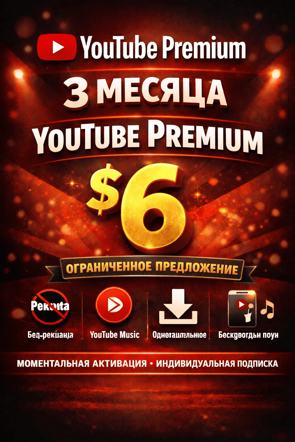 • Аккаунт не должен ранее иметь YouTube Premium