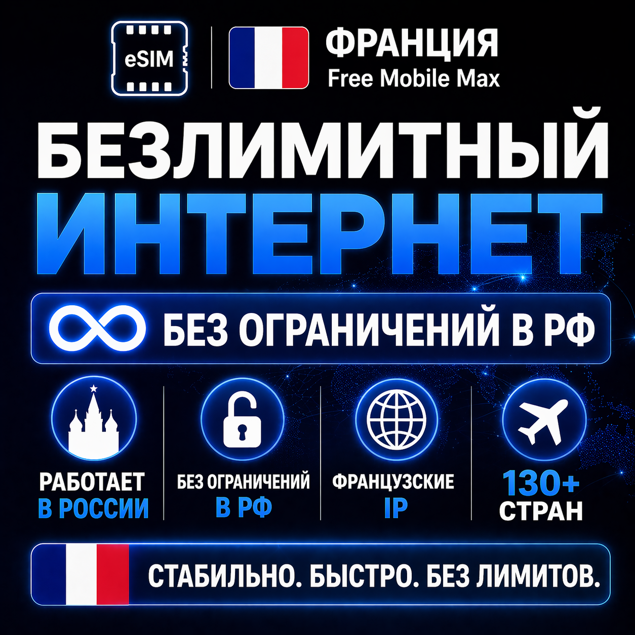 eSIM Франция Free Mobile Max | Безлимит интернет | Работает в РФ и 130+ странах