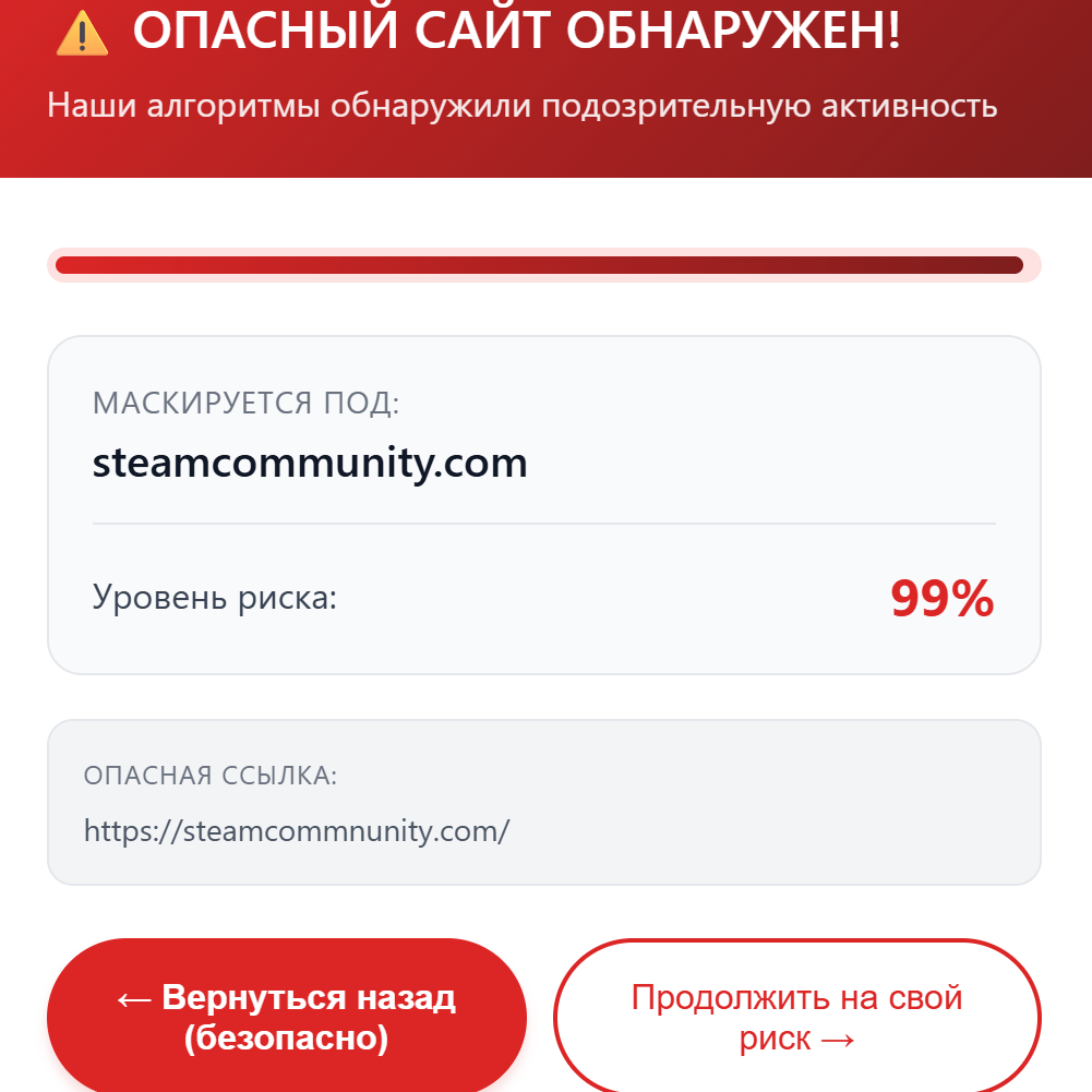 Расширение анализирует каждую ссылку, на которую вы кликаете. В основе лежит математический алгоритм — расстояние Левенштейна. Если домен визуально похож на настоящий сайт, но не совпадает с ним — переход блокируется мгновенно.